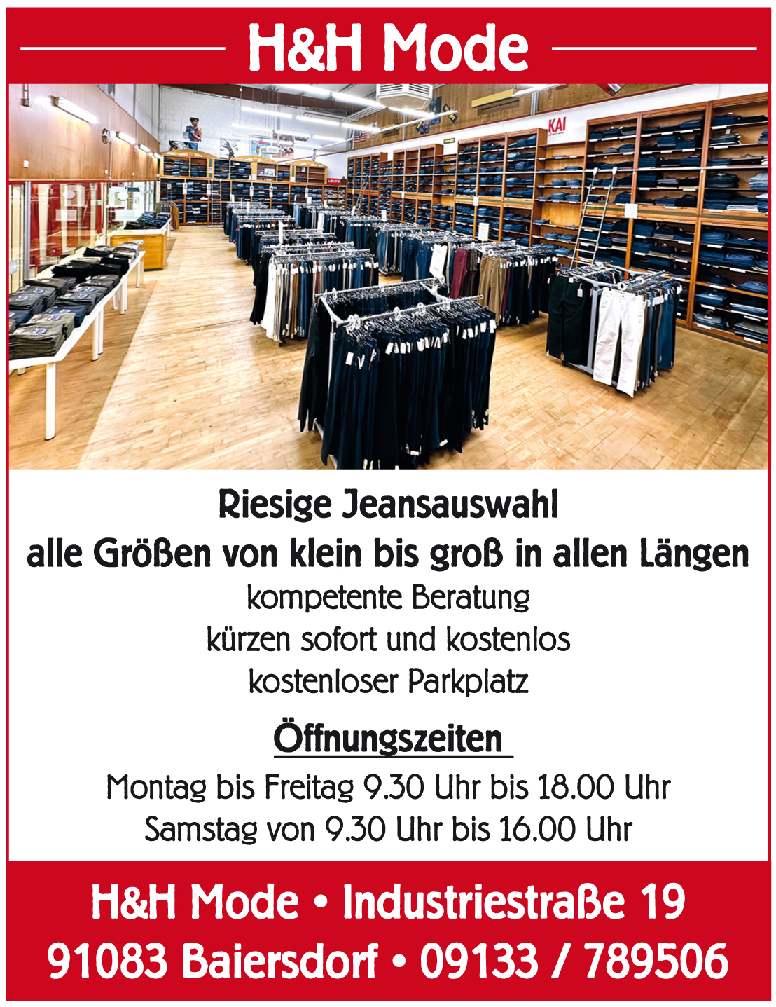 Wenn Sie eine Jeans benötigen, können Sie uns gerne von Montag bis Freitag von 10.00 - 18.00 Uhr und Samstag von 10.00 - 16.00 Uhr unter Telefon 09133 / 78 95 06 anrufen oder uns eine Mail an hhmode@t-online.de schreiben. EIN VIELFÄLTIGES ANGEBOT ERWARTET SIE!